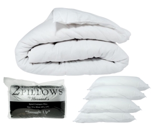 • x 2 Packs Luxury hollowfibre pillow pair. Filling: 650g spiral conjugate fibre. 74 x 48cm / 29″ x 19″. Machine washable at 40c. • x 1 Duvet Hollowfibre filled. Polycotton cased • Contains 4 Pillows |