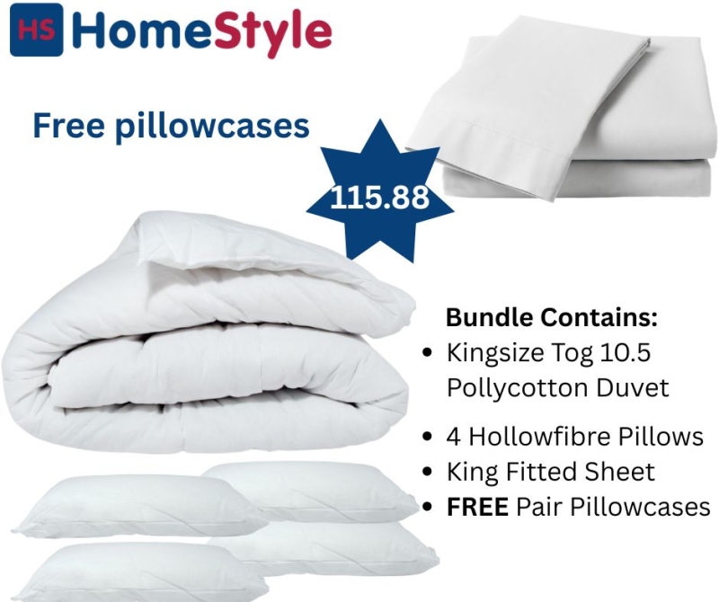 • White Pillowcases 180 Thread Count easy care blend of 50% combed cotton and 50% polyester • Kingsize Duvet Hollowfibre filled. Polycotton cased • x 4 Luxury hollowfibre pillows. Filling: 650g spiral conjugate fibre. 74 x 48cm / 29″ x 19″. Machine washable at 40c. • White Fitted Sheet 180 Thread Count easy care blend of 50% combed cotton and 50% polyester |