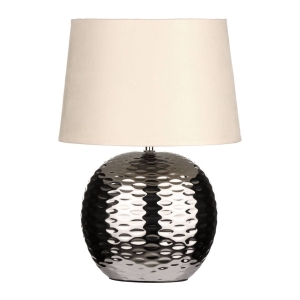 • Beige fabric shade • Textured ceramic base • Silver finish Base • Dimensions: H40 x D30 x W30 • Contemporary |